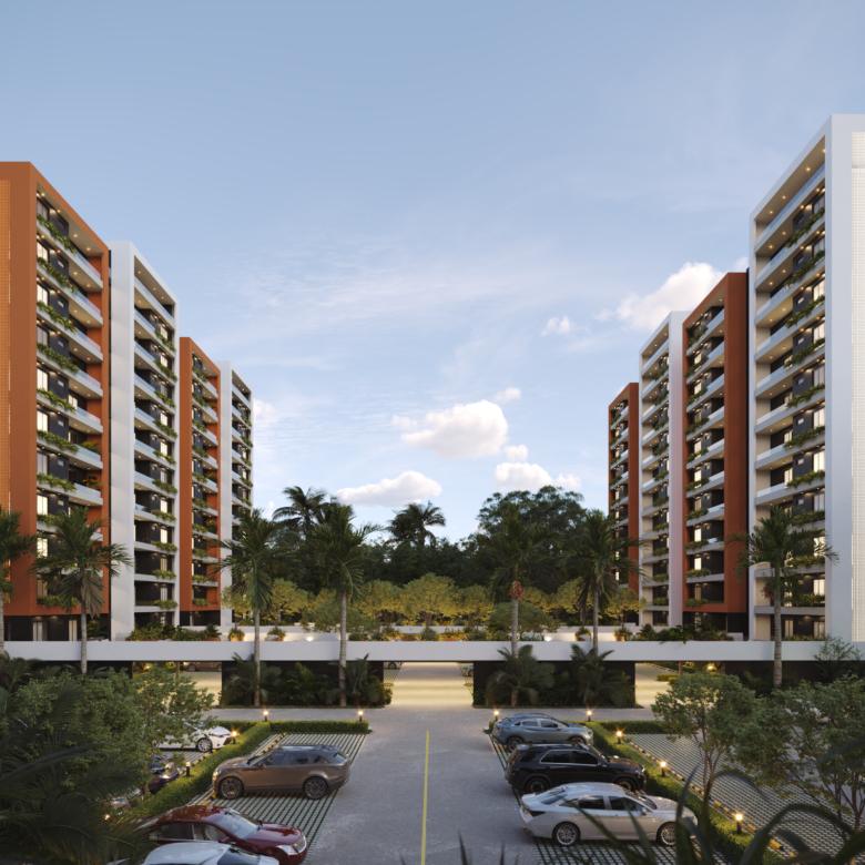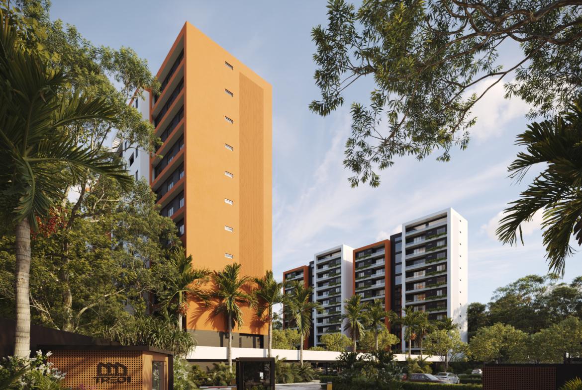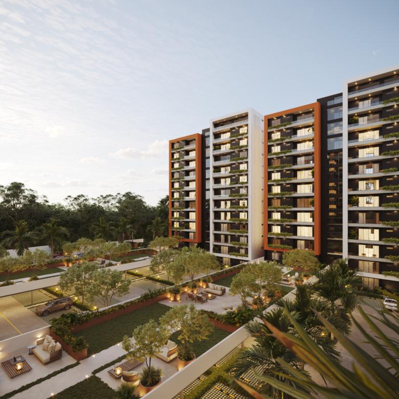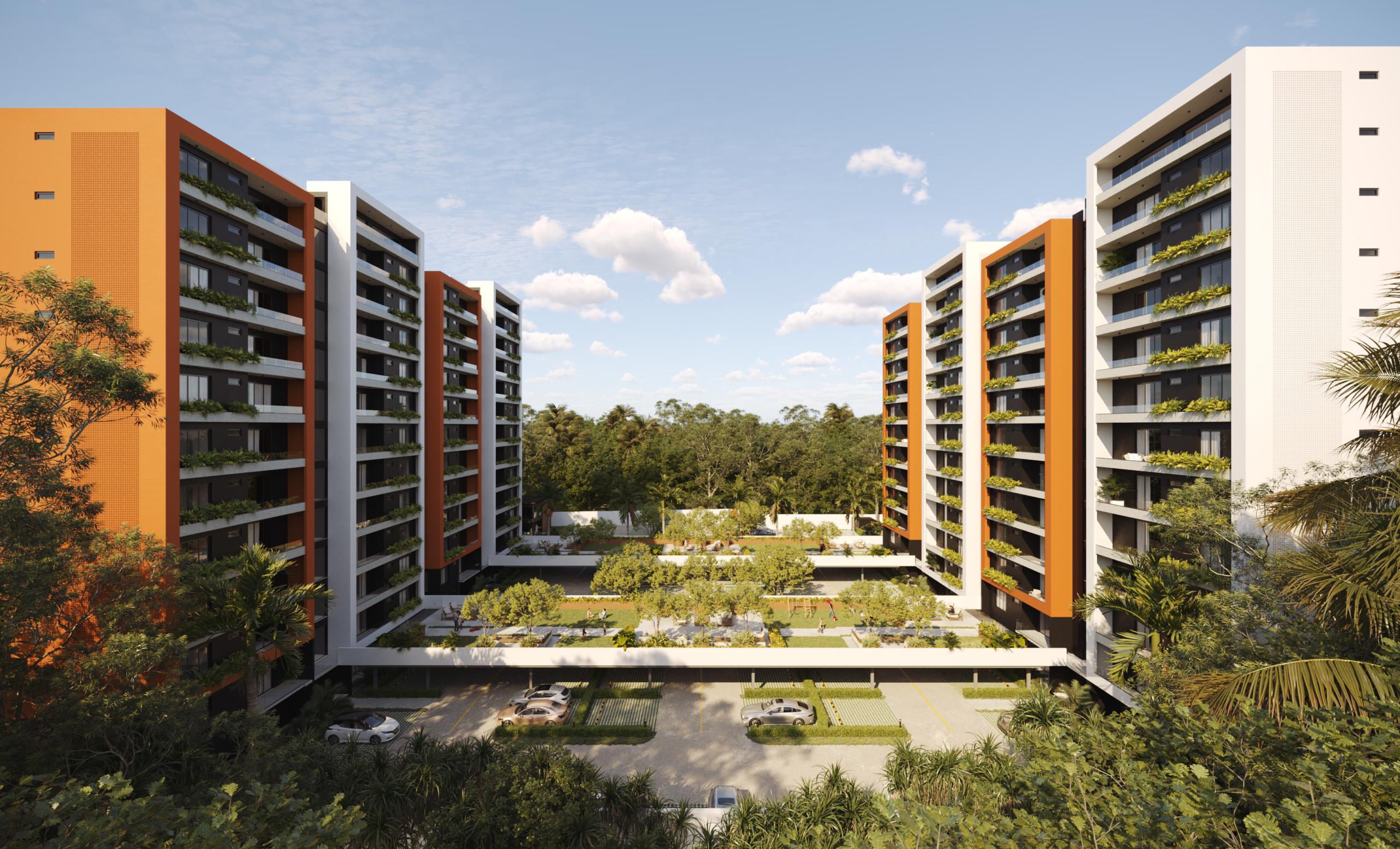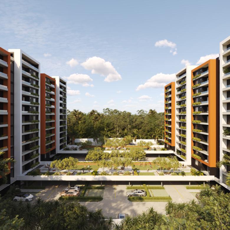Este innovador desarrollo está compuesto por cuatro torres residenciales de diseño contemporáneo, fachadas modernas en tonos tierra y amplios balcones con vegetación integrada, creando una armonía perfecta entre vida interior y exterior.