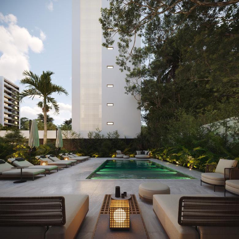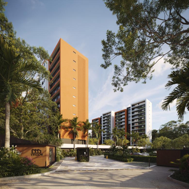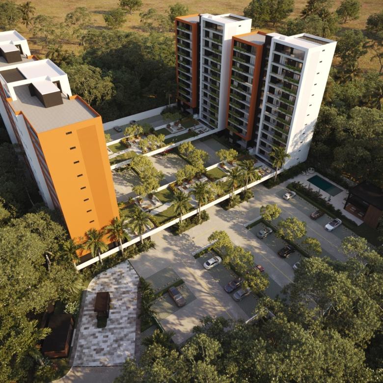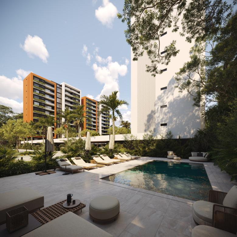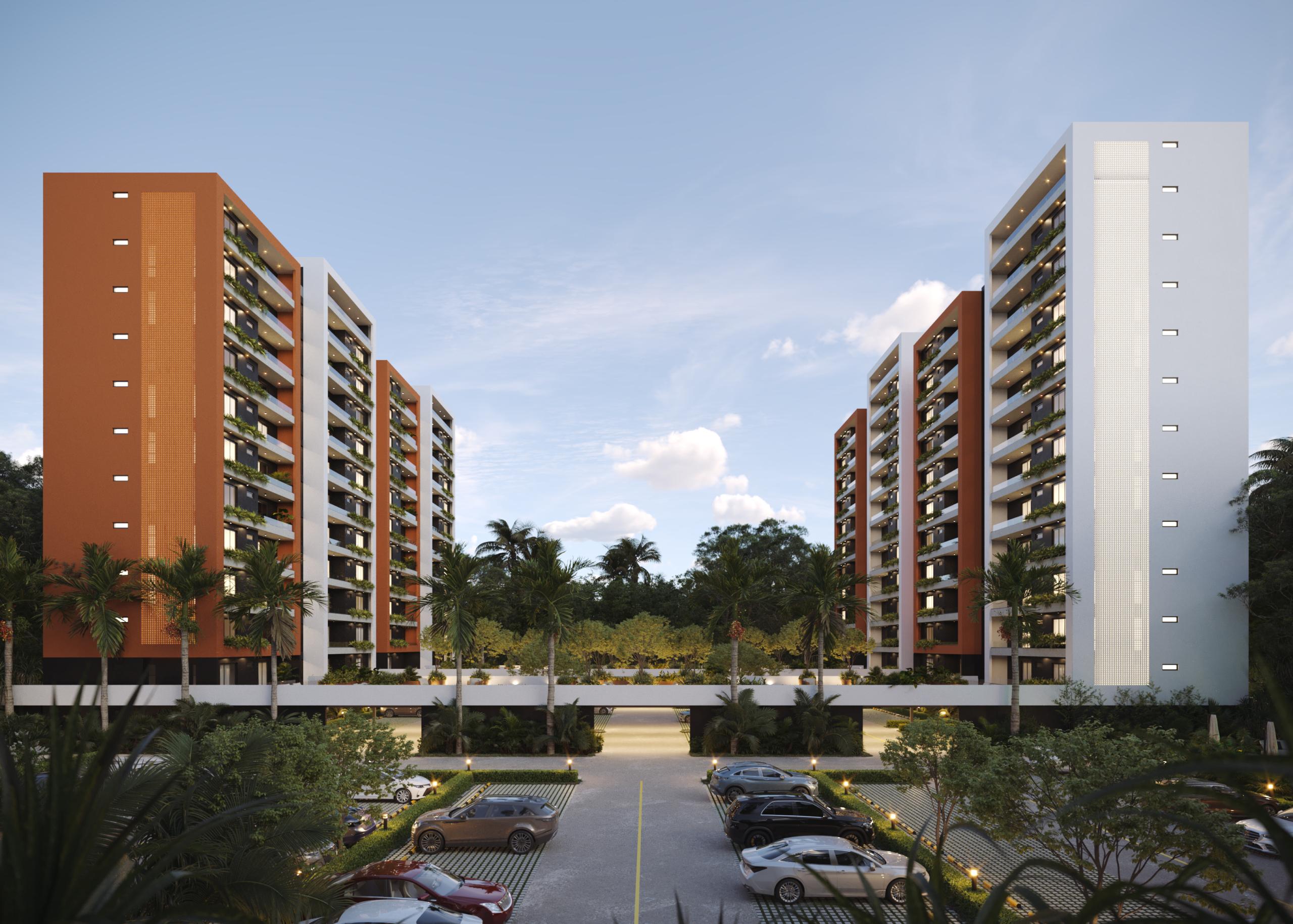 Este innovador desarrollo está compuesto por cuatro torres residenciales de diseño contemporáneo, fachadas modernas en tonos tierra y amplios balcones con vegetación integrada, creando una armonía perfecta entre vida interior y exterior.